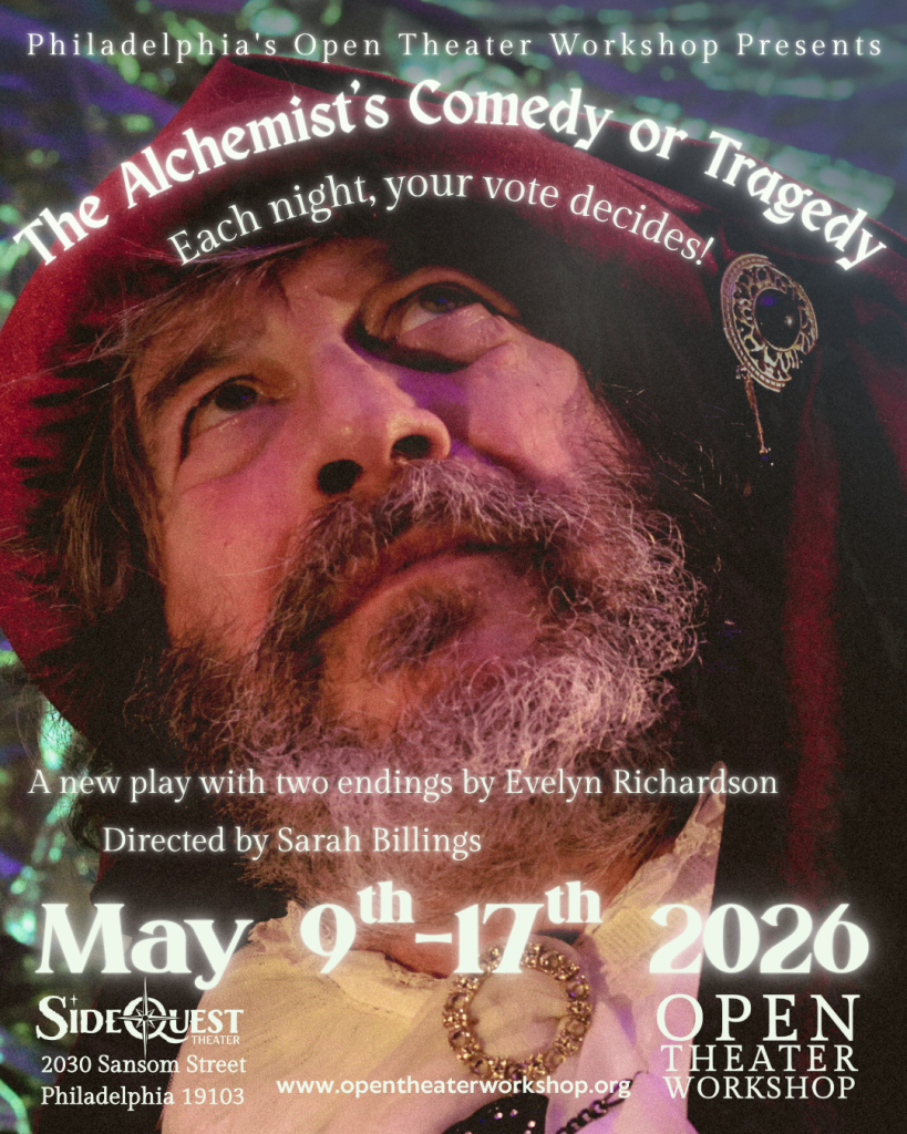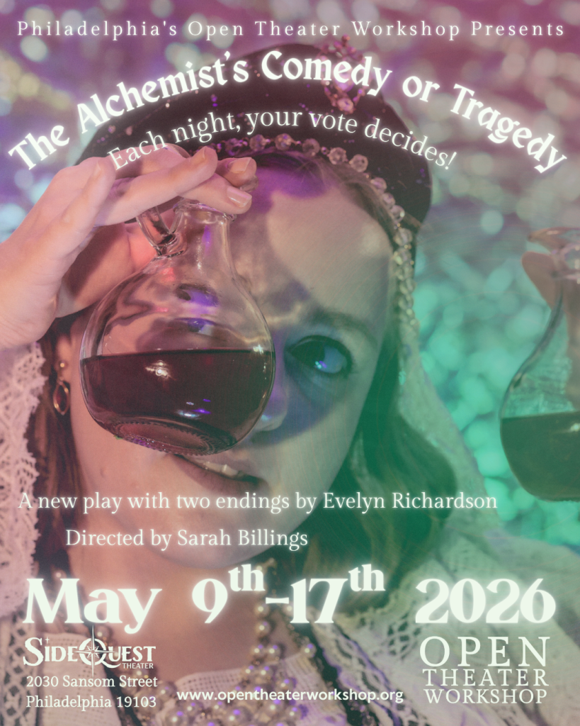 Join Open Theater Workshop for our production of The Alchemist’s Comedy… or Tragedy by Philadelphia playwright Evelyn Richardson! Set just after the invention of the printing press, watch Aurelia, the daughter of the court alchemist, race against the clock to navigate castle politics and unravel her father’s secret notes to attain the highest goal of alchemy: transmutation of lead into gold–before it’s too late. In this new play written in verse, the audience controls Aurelia’s most fateful decision; deciding whether the story reaches a comic or tragic conclusion.