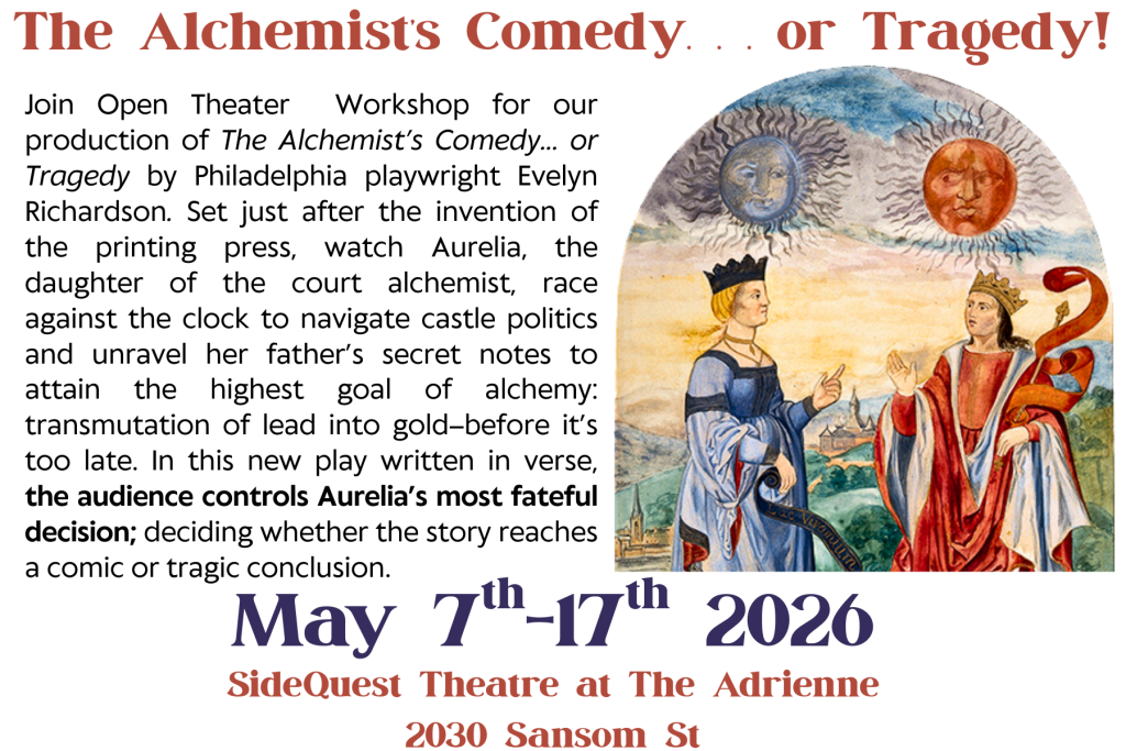 The Open Theater Workshop is currently investigating The Alchemist’s Comedy–or Tragedy by Evelyn Richardson and Proteus by Steven Glavey, two world premiere plays with community productions coming up in 2026.